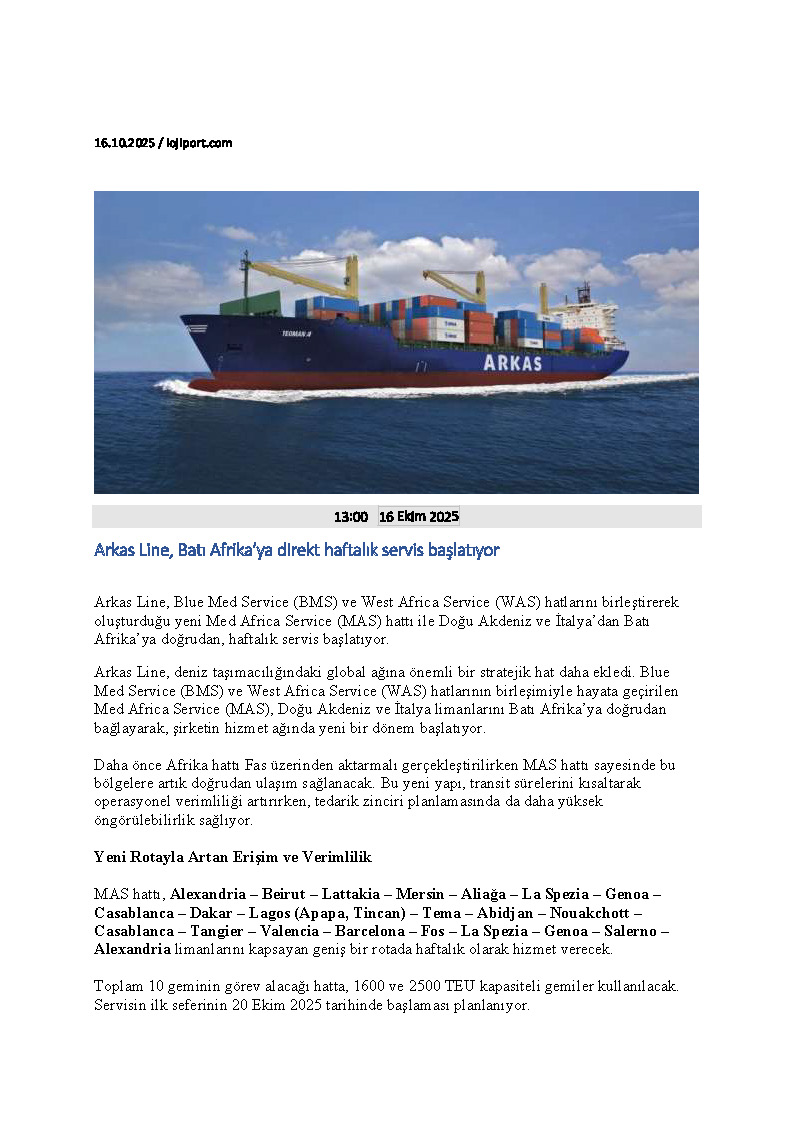 Arkas Line, Doğu Akdeniz ve İtalya’dan Batı Afrika’ya Direkt Haftalık Servis Başlatıyor
