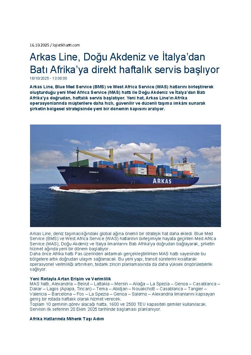 Arkas Line’ın Afrika Stratejisinde Yeni Dönem: Doğu Akdeniz ve İtalya’dan Batı Afrika’ya Direkt Haftalık Servis Başlıyor