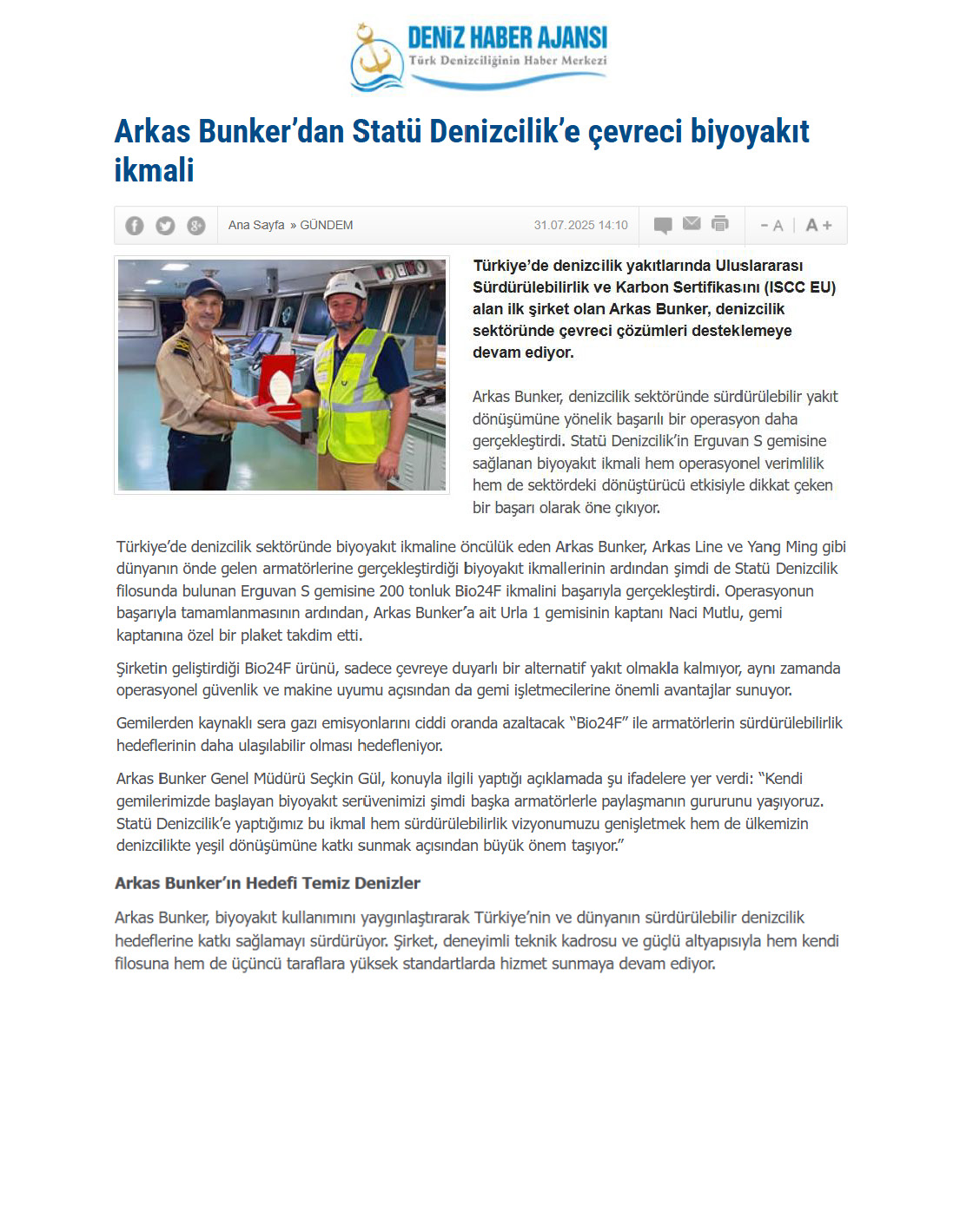 Arkas Bunker Successfully Supplies Biofuel To Statu Denizcilik’s Vessel Erguvan S
