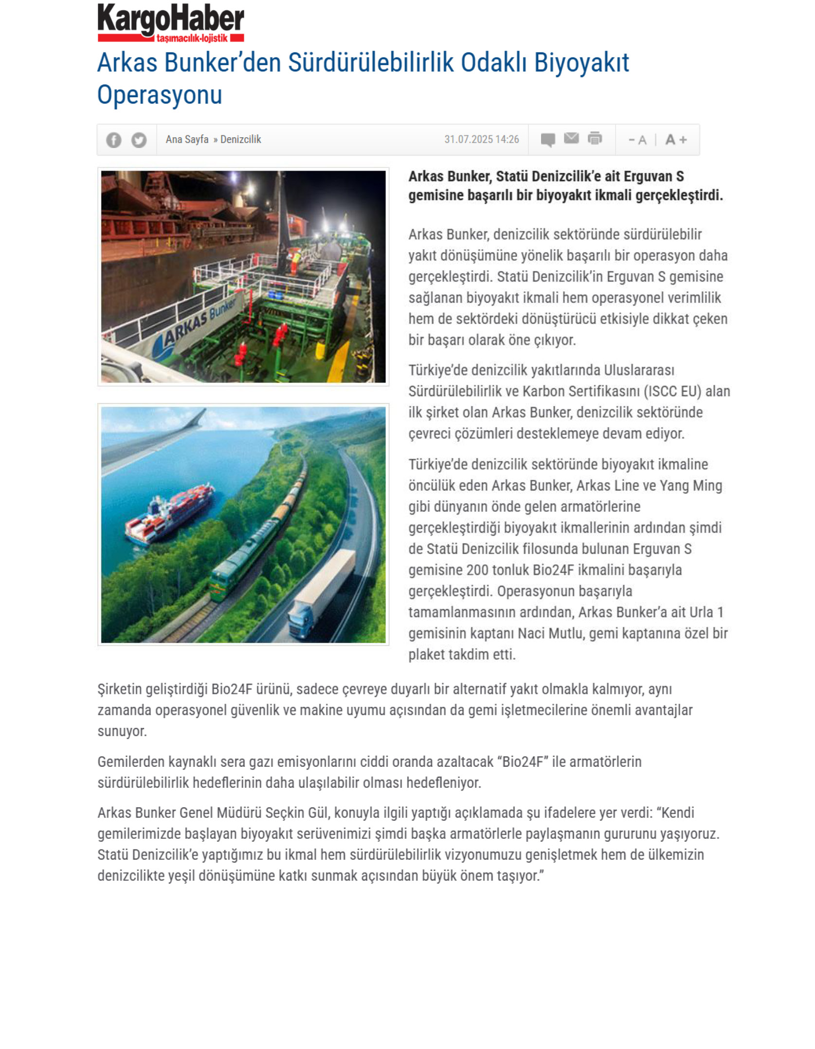Arkas Bunker Successfully Supplies Biofuel To Statu Denizcilik’s Vessel Erguvan S