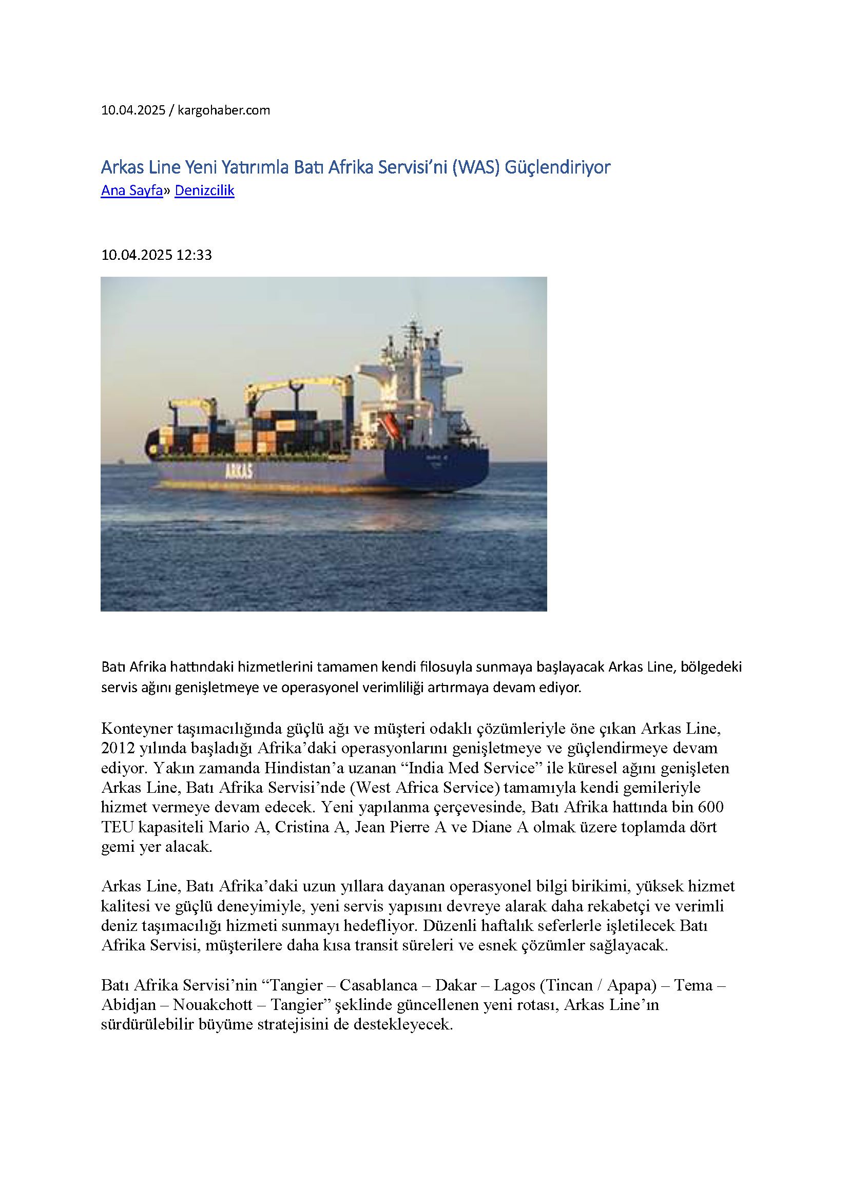 Arkas Line commences news West Africa service