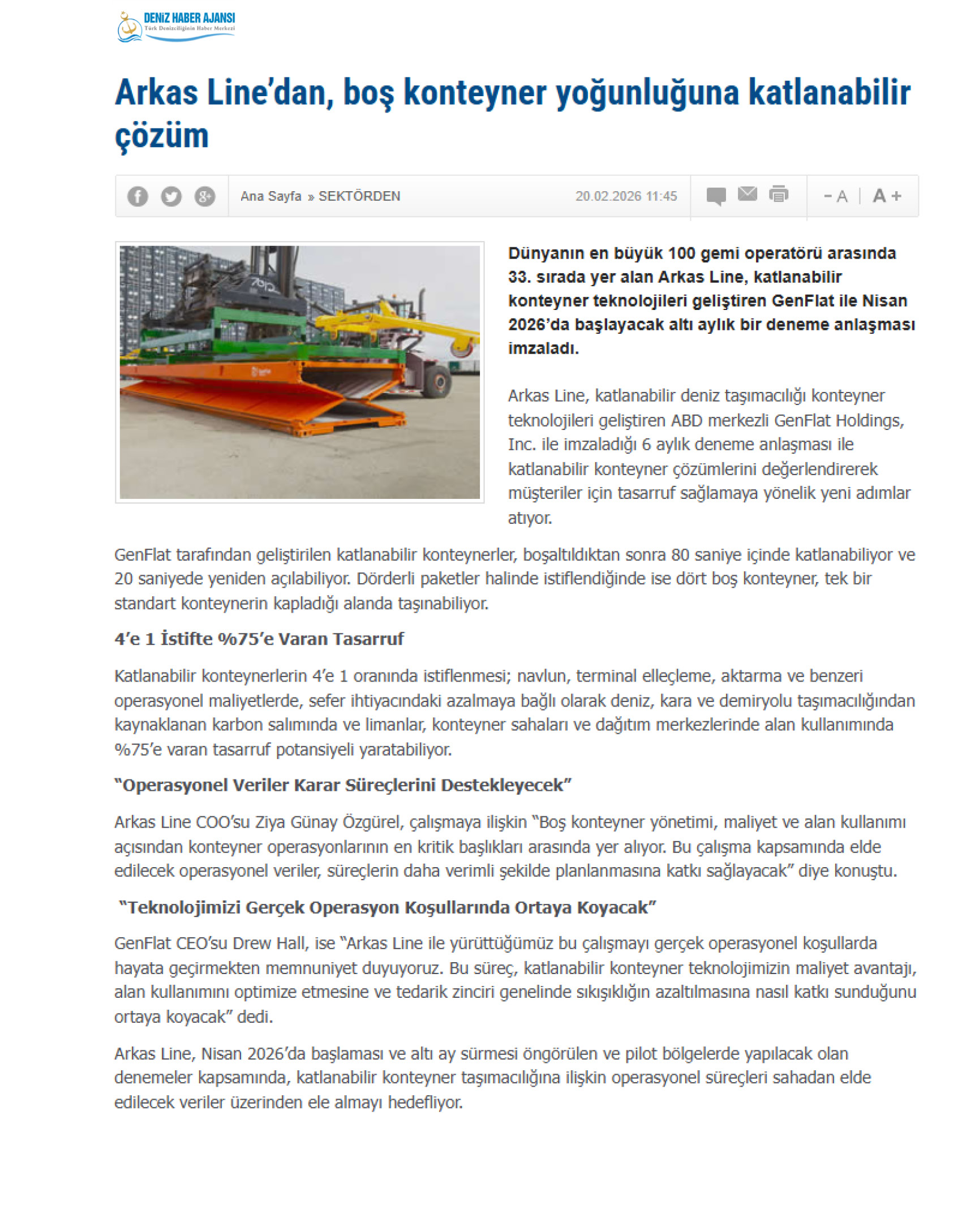 Arkas Line, Gen Flat İle Deneme Anlaşması Yaptı