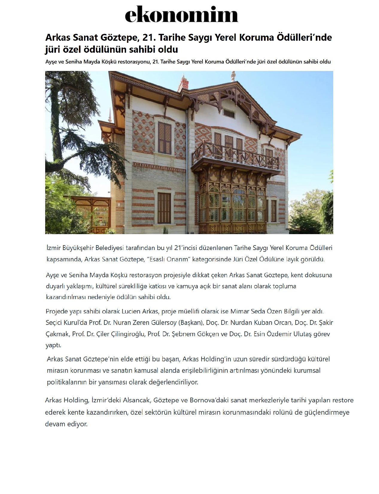 Arkas Sanat Göztepe, 21. Tarihe Saygı Yerel Koruma Ödülleri’nde Jüri Özel Ödülünün Sahibi Oldu