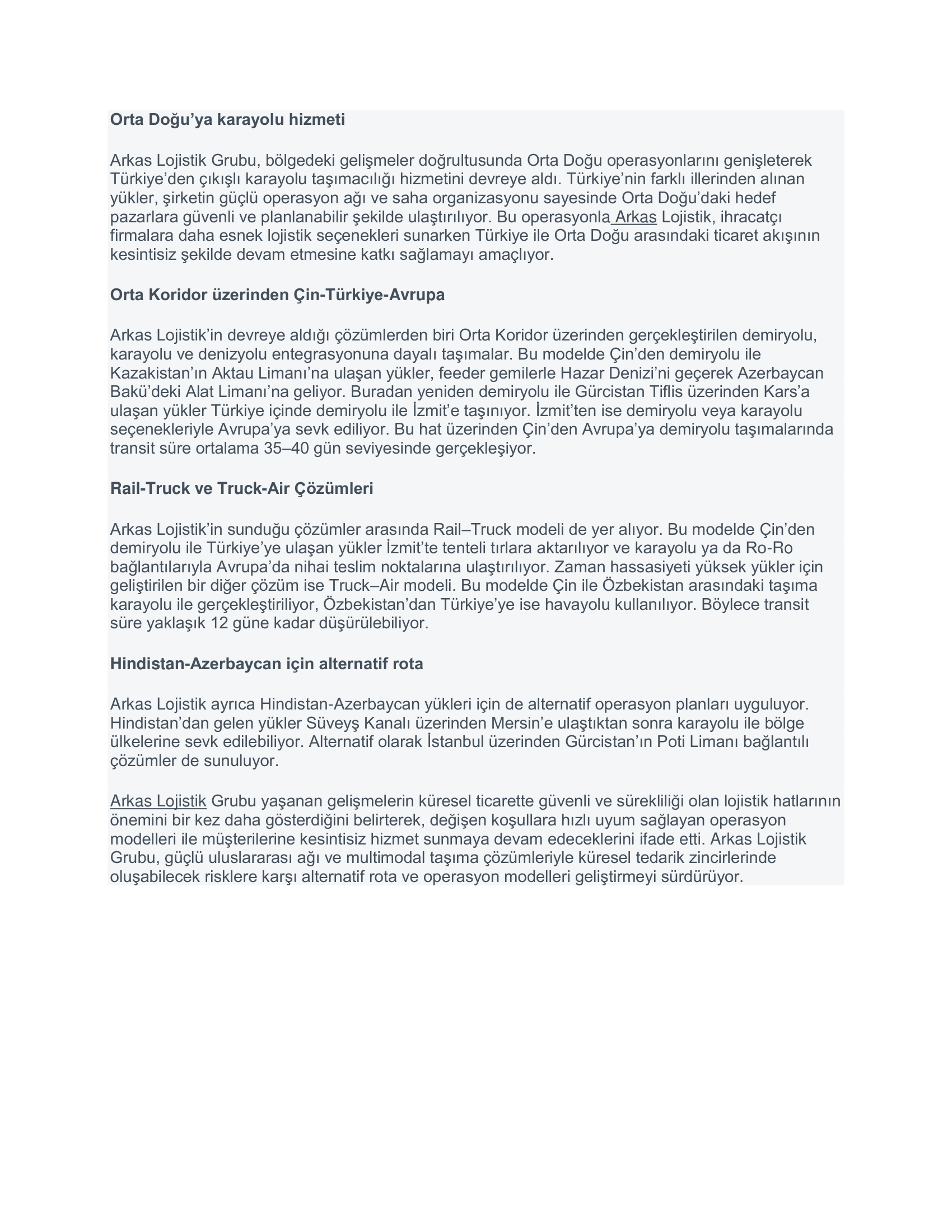 Arkas’dan Asya Avrupa Taşımalarında Alternatif Öneriler