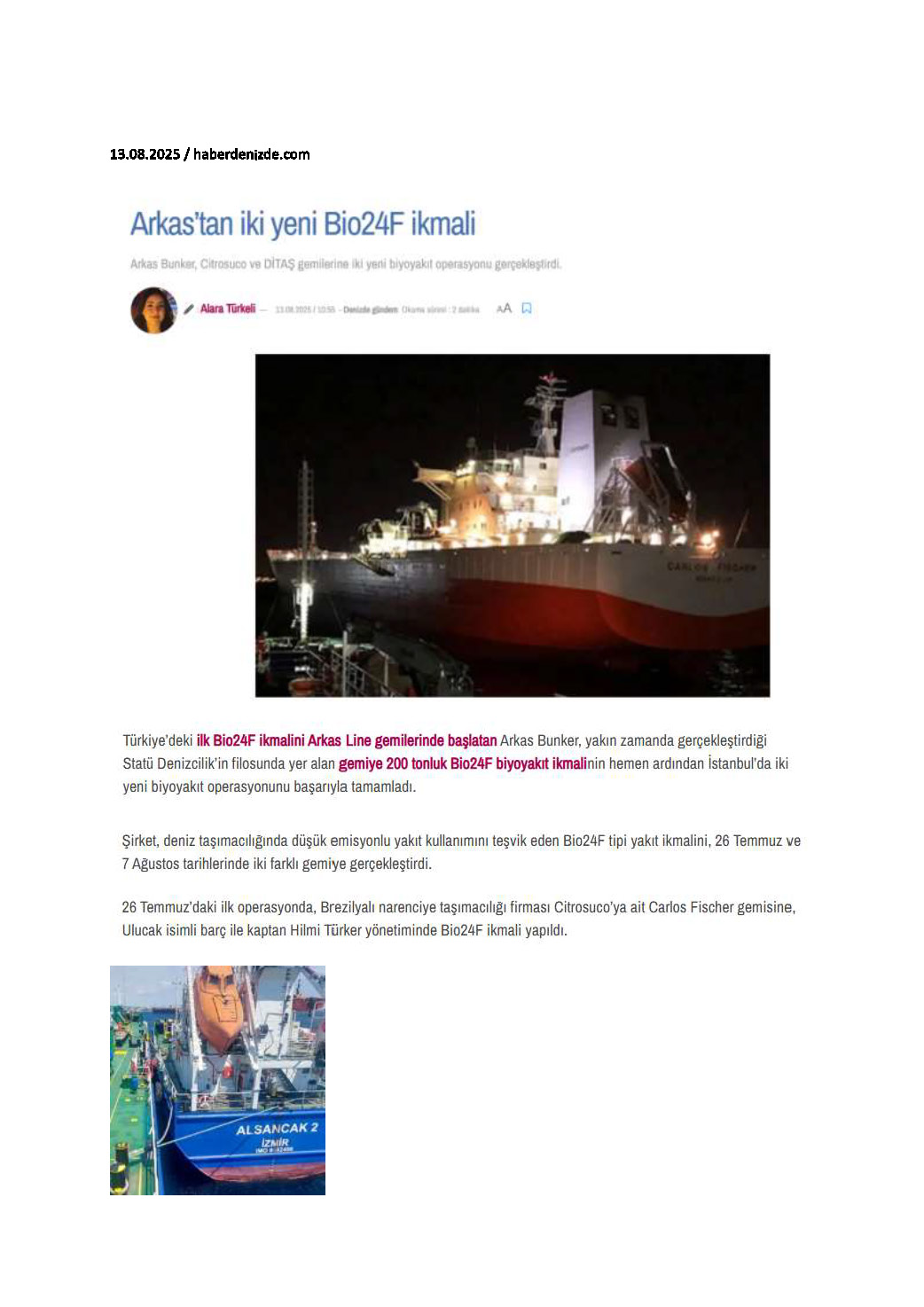 Arkas Bunker’dan Citrosuco Ve Ditaş’a Biyoyakıt İkmali