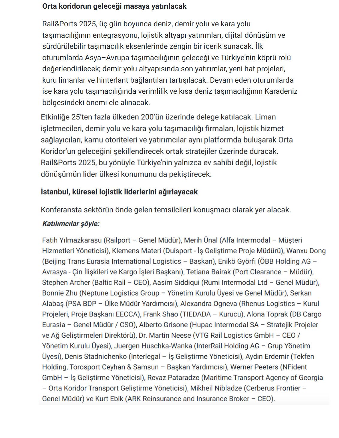 Rail&Ports 2025’te Orta Koridor’un Geleceği İstanbul’da Konuşulacak