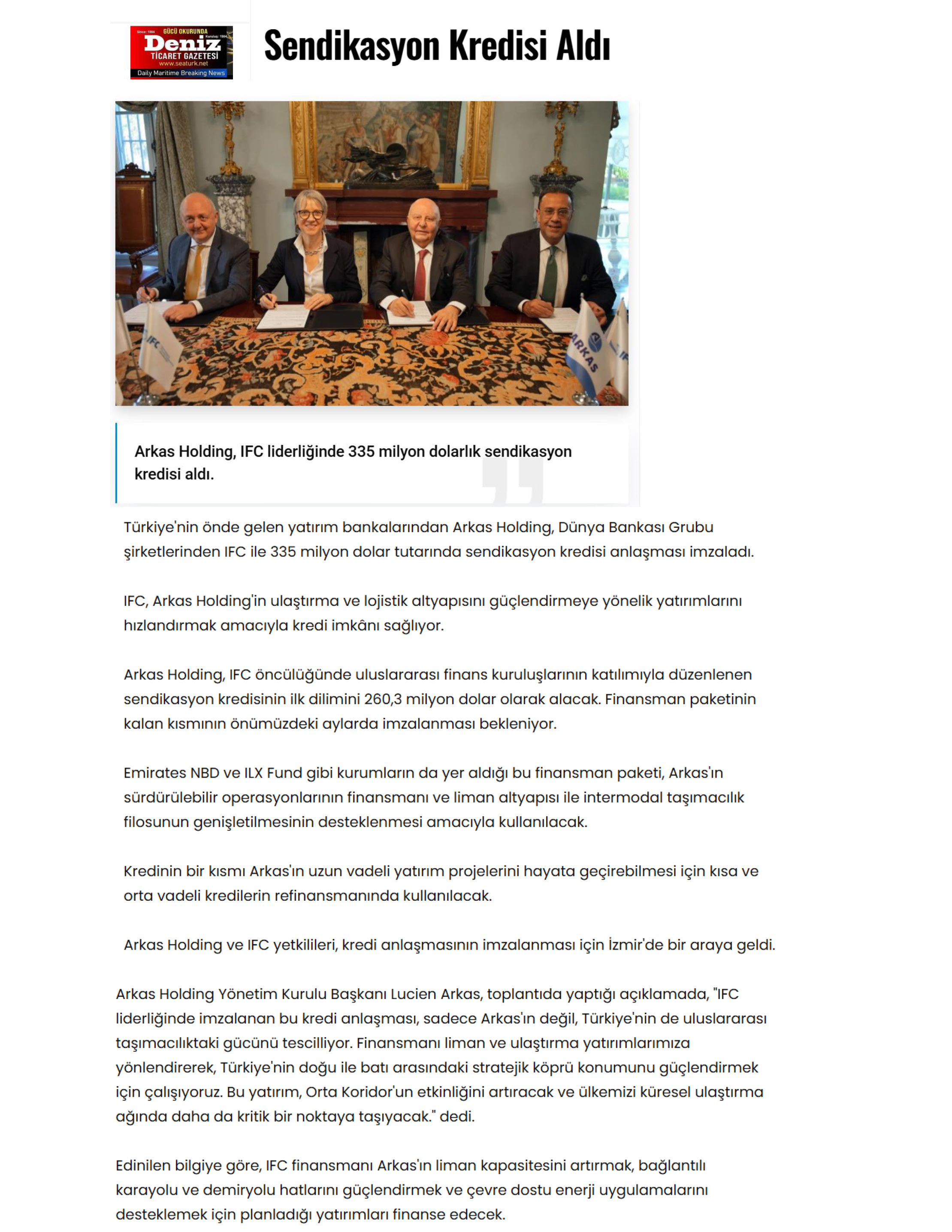 Arkas’a IFC Liderliğinde Sendikasyon Kredisi